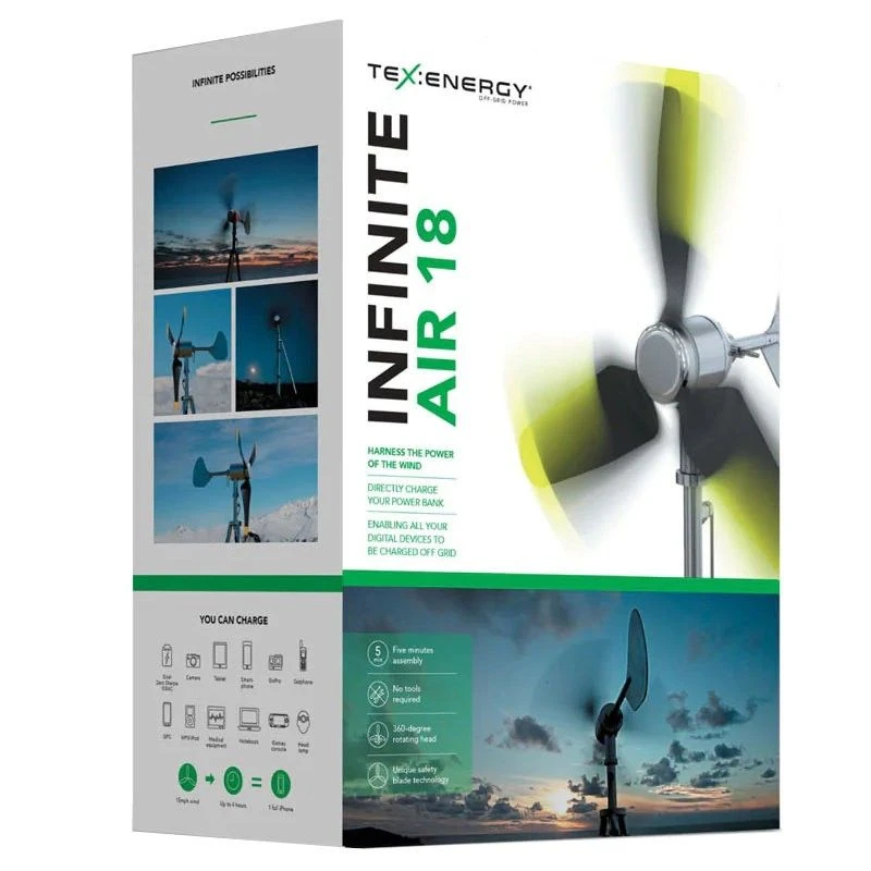 Il est difficile de faire plus performant avec un volume de rangement aussi avantageux : l’éolienne Infinite Air 18 du groupe Texenergy fait partie des éoliennes nomades et des éoliennes portables les plus puissantes du marché. Et pour cause, elle charge aussi bien en 5 V, en 12 V ou en 18 V. Ainsi, tous vos appareils rechargeables de 5, 12 ou 18 V peuvent être alimentés en énergie propre et illimitée aussi bien le jour ou la nuit, où que vous soyez sur la planète : vous aurez toujours un moyen de recharger votre batterie même au beau milieu de votre trekking, de votre randonnée ou de votre voyage et même en pleine expédition. Résultat : vous ne risquez plus de tomber en panne de Smartphone, de tablette ou de GPS, ni même de Notebook, d’équipement médical ou de batterie externe Goal Zero Sherpa 100AC. Il peut pleuvoir (norme d’étanchéité IP65), il peut faire froid (-20°C) ou il peut faire chaud (40°C), votre éolienne Texenergy continue de fonctionner : il suffit juste qu’il y ait du vent, même faible (12 km/h minimum) ou fort (74 km/h maximum) ce qui garantit une grande amplitude d’utilisation.