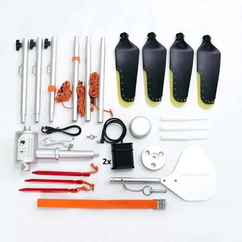 Une éolienne nomade qui alimente ou recharge votre appareil de 5 V (USB) ou votre appareil de 12 à 18 V (DC), c’est possible avec l’éolienne portative Texenergy Infinite Air 18. Par exemple, 4 heures suffiront pour recharger votre téléphone portable (type iPhone notamment). L’énergie libérée par la turbine dynamo de l’éolienne Infinite Air 18 est immédiate : aucune perte de temps. L’installation ou la désinstallation de cette éolienne portable ne prend que 5 minutes. Montée et prête à l’emploi, sa hauteur atteint 1 mètre et son hélice a une circonférence de 0,5 mètre. La base pivote à 360° pour s’adapter en permanence au sens du vent. Démontée et rangée, elle se stocke à l’intérieur d’une petite sacoche de protection et de transport (sacoche fournie) : stockage sûr et compact (volume : 34 x 25 x 11 cm). Le kit Texenergy Infinite Air 18 comprend : l’éolienne complète, le trépied complet, les piquets d’ancrage (pratique en cas de temps venteux à fort coefficient), les câbles de connexion USB et USB-C et les câbles de connexion DC ainsi que le transformateur 12 V, le transformateur 18 V et bien sûr la sacoche. Poids total de l’ensemble : 3250 grammes. Bon à savoir : votre éolienne Texenergy Infinite Air est visible même dans l’obscurité (pales avec zone luminescente). Notre recommandation : utilisez une batterie nomade ou une batterie externe entre votre appareil et l’éolienne. Les performances seront ainsi optimales, même en cas de vent irrégulier.