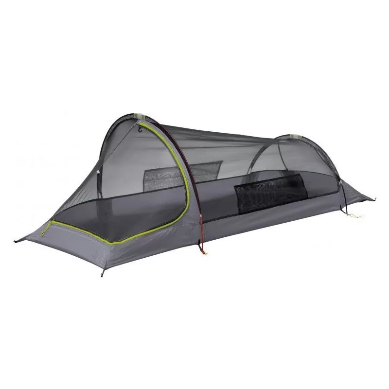 Les parois de la chambre sont en tissu de type moustiquaire : aération optimale et protection anti-insectes optimale également. Le double toit est en polyester Diamond (matière imperméable et thermo-isolante) avec une imperméabilité de 2000 mm. Le parterre est en polyester thermo-isolant avec une imperméabilité de 2500 mm. Les coutures sont systématiquement étanchées. La pluie n’est donc pas un problème. Notez que la tente Ferrino Sling adopte une forme de tente tunnel et possède des haubans bien répartis : bonne résistance au vent. Dedans, on trouve ce qu’il faut pour suspendre une lampe de poche (crochet porte-lampe) et ce qu’il faut pour ranger près de soi quelques affaires importantes (poche porte-objet). Inclus : kit de réparation.