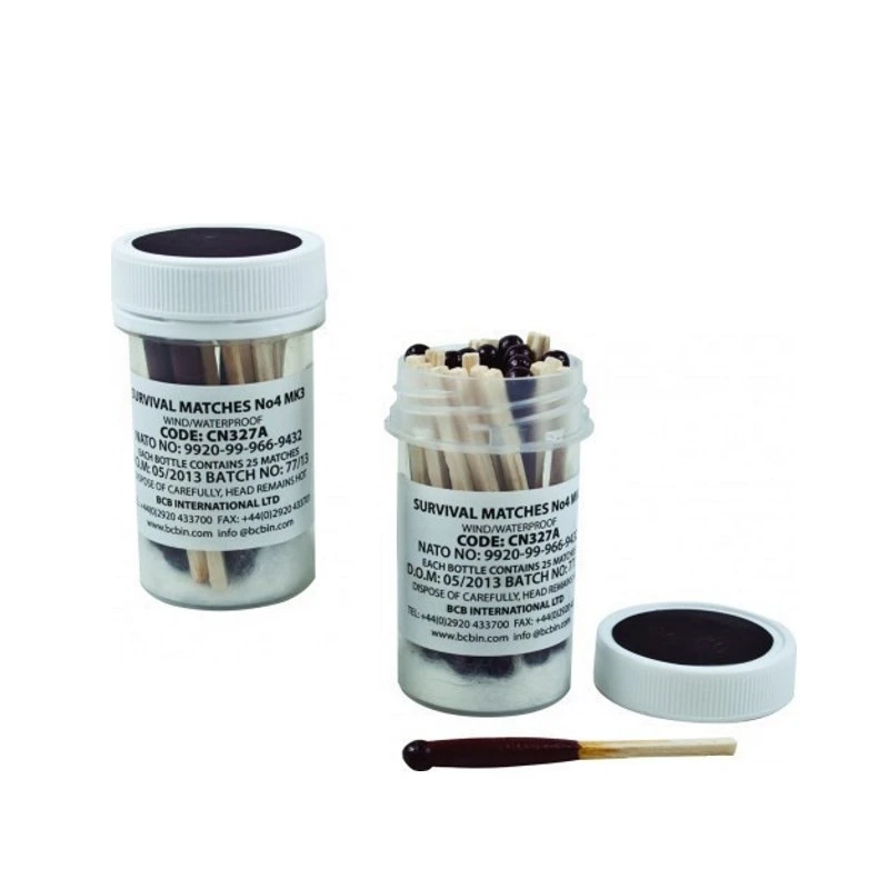 Utilisées par les militaires et approuvées par l’OTAN (Organisation du Traité de l’Atlantique Nord), les allumettes de survie BCB ont une autonomie de 10 secondes par allumette même sous le vent ou sous la pluie : ce sont à la fois des allumettes Windproof et des allumettes Waterproof. Elles sont vendues par boîte de 25. La boîte mesure 55 mm de long et 30 mm de diamètre pour un poids total de 25 grammes. Les allumettes ont une longueur de 50 mm. Usages : survie, Bushcraft et trek.