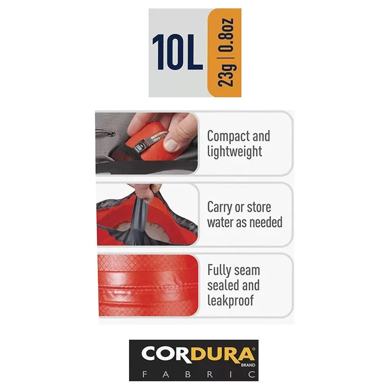 Il peut transporter 10 litres d’eau ou 10 kilos de matériel tel un véritable seau mais il est extrêmement compact car entièrement pliable. En effet, le seau pliable Sea to Summit Ultra-Sil Folding Bucket est à la fois très souple, solide et stockable dans une petite housse de transport (housse fournie). Il cache bien son jeu : il ne prend pas plus de place qu’une échalote quand il est rangé. Mais déplié, on prend toute la mesure de ce seau pliant : c’est un sac à eau d’une contenance totale de 10 litres. Il convient parfaitement pour du camping, en bivouac ou en trek.