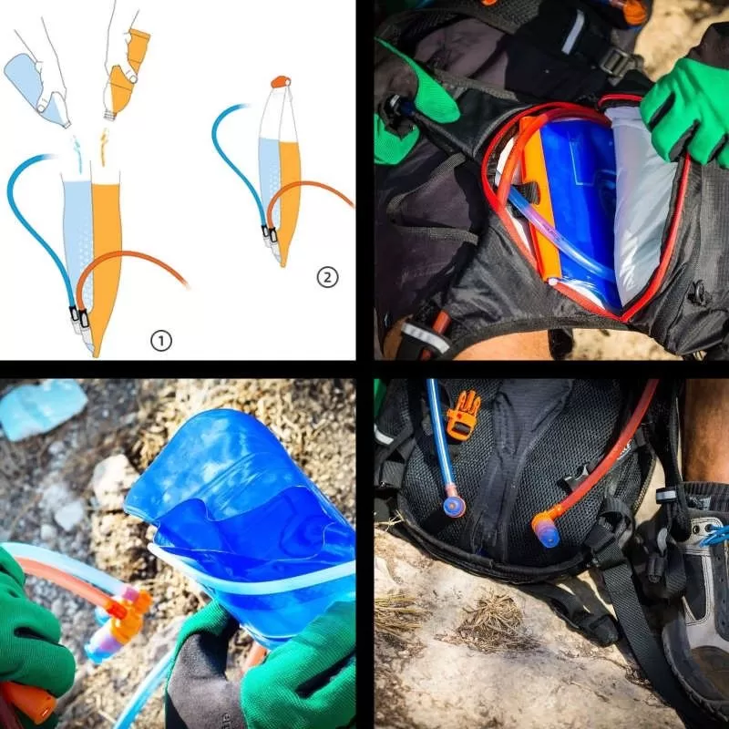 Toutes les poches à eau normales proposent uniquement un compartiment pour le stockage de votre eau ou de votre boisson. La poche à eau Source Widepac Divide 2L va plus loin et est divisée en 2 parties, si bien qu’elle propose 2 compartiments, d’où le terme Divide. On a donc 2 poches à eau regroupées en une seule : il y a non seulement 2 compartiments mais également 2 valves et 2 tubes de couleur différente pour pouvoir les différencier à tout moment. Par conséquent, on peut stocker et boire 2 liquides différents dans la même poche à eau. Par exemple, on peut prévoir 1 litre d’eau et 1 litre de boisson énergisante en même temps mais de façon bien séparée. Pour autant, le modèle Widepac Divide 2L conserve des dimensions assez normales : longueur de 37 cm et largeur de 19,5 cm (utilisation possible dans la grande majorité des sacs à dos). Idem pour le poids : 260 grammes.