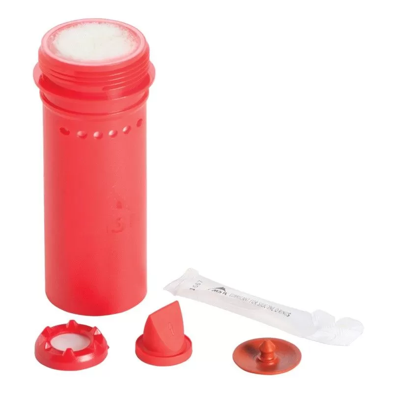 Certifiée pièce d’origine 100% conforme, la cartouche de filtre Trailshot de la marque MSR possède bien sûr exactement les mêmes caractéristiques que la cartouche filtrante initiale de votre filtre Trailshot. Son autonomie est toujours de 2000 litres. Son poids est de 30 grammes, sa longueur est de 8,5 cm et son diamètre est de 3 cm. Sa composition est également inchangée : filtre en fibres creuses capable d’écarter toutes les bactéries, les protozoaires et les particules fines de votre eau (haute efficacité : 99,99%). Avec cette cartouche MSR, plusieurs autres éléments sont fournis d’office : les instructions d’entretien et les pièces de rechange courantes (valves) ainsi qu’un petit tube de lubrifiant.